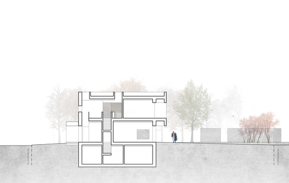 Die Grundidee der Horizontalität wird im Entwurf durch drei Baukörper abgebildet - das Haupthaus, das Gästehaus und die Garage. Diese drei Elemente staffeln sich zueinander und gliedern die unterschiedlichen Nutzungen.